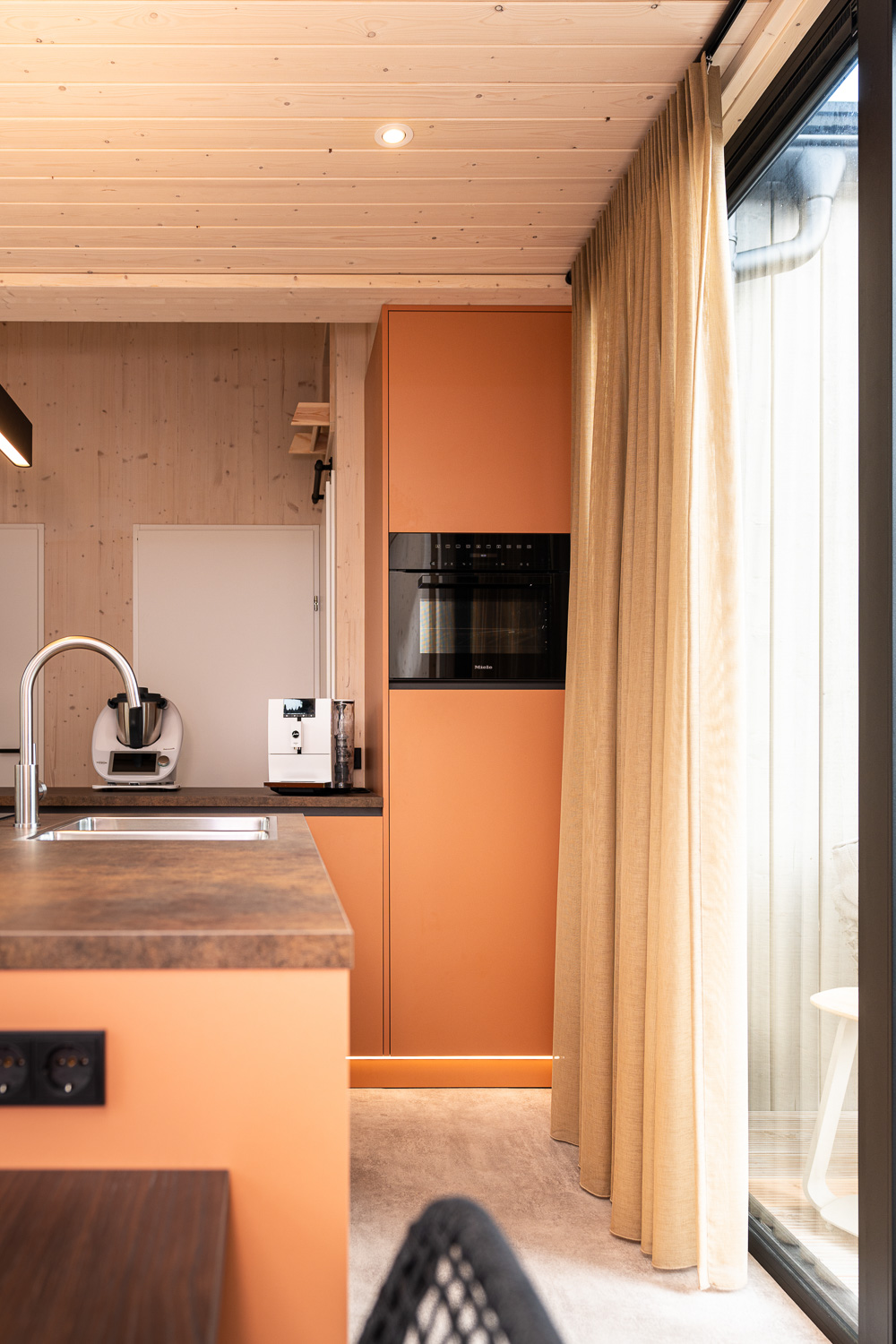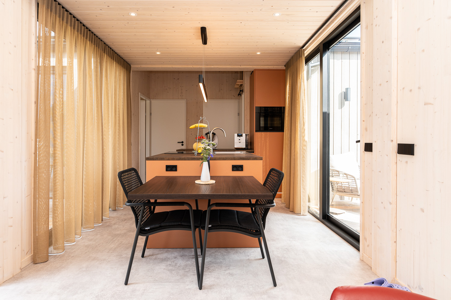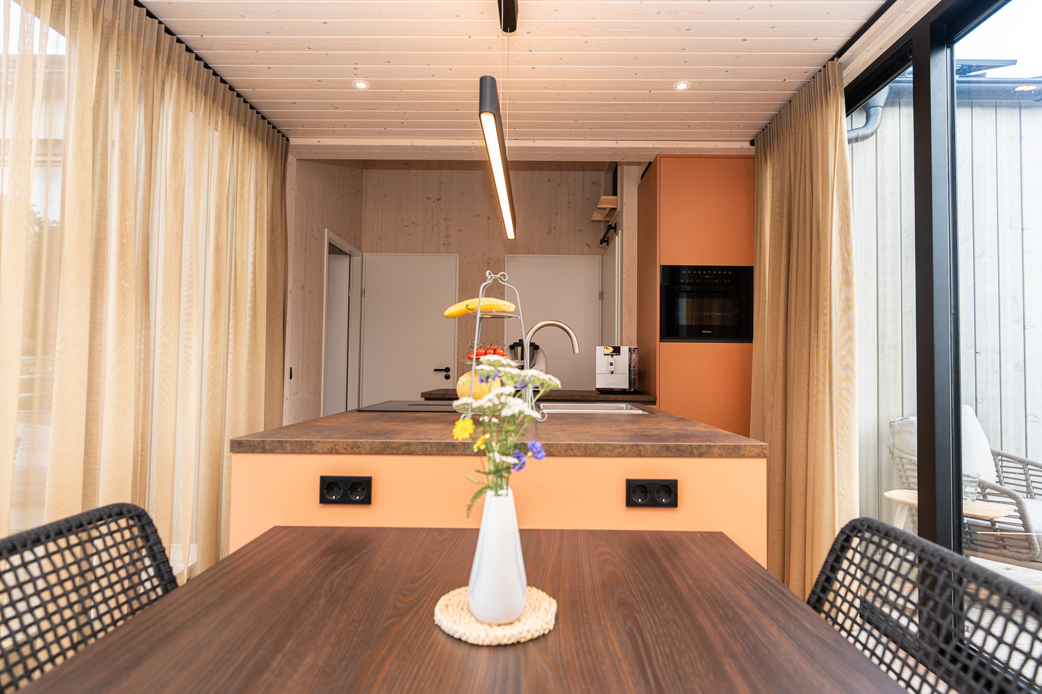 De vakantiewoning profiteert optimaal van het vele lichtinval en de connectie tussen binnen en buiten. De keuken versterkt dit gevoel en maakt de woning niet alleen praktisch, maar ook sfeervol en uniek.