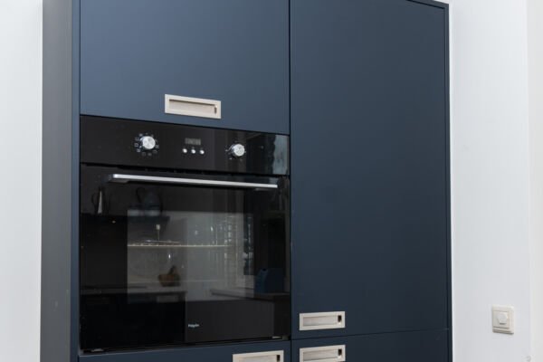 De kleur indigo blauw is tot in detail doorgevoerd, zelfs aan de binnenzijde van de kasten, wat zorgt voor