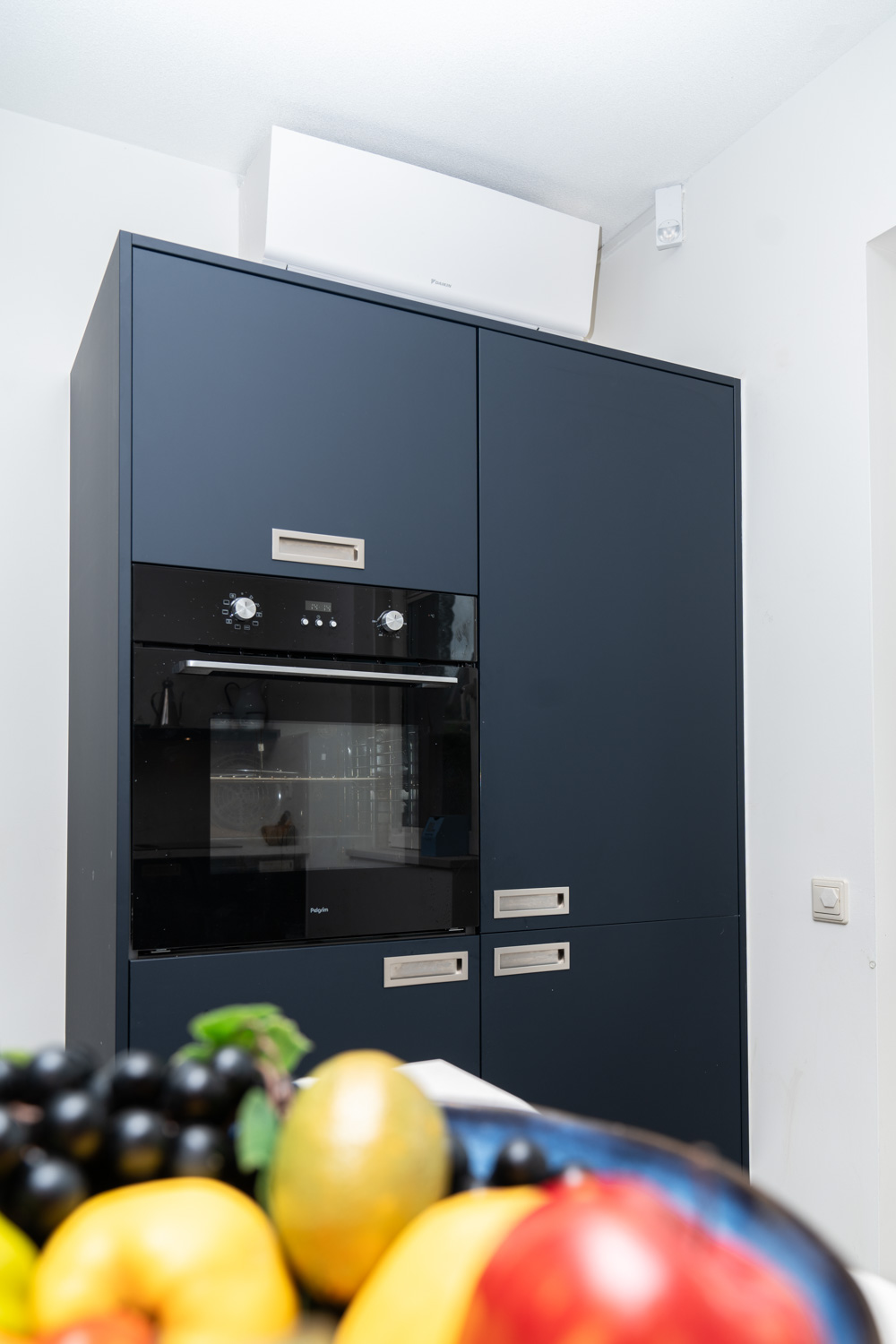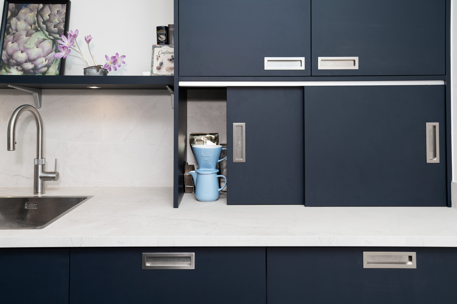 De kleur indigo blauw is tot in detail doorgevoerd, zelfs aan de binnenzijde van de kasten, wat zorgt voor