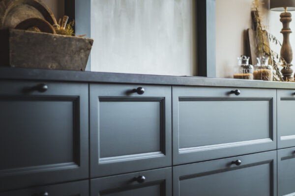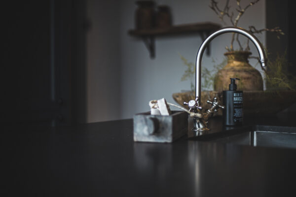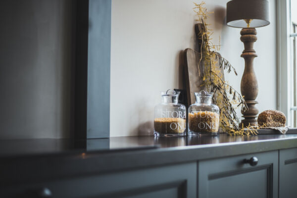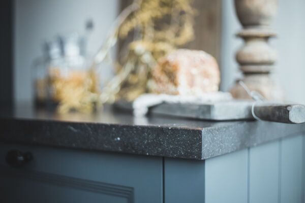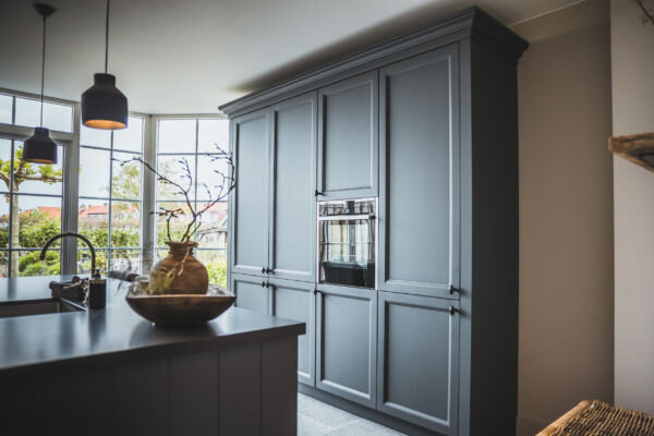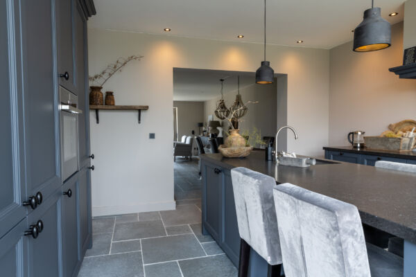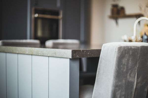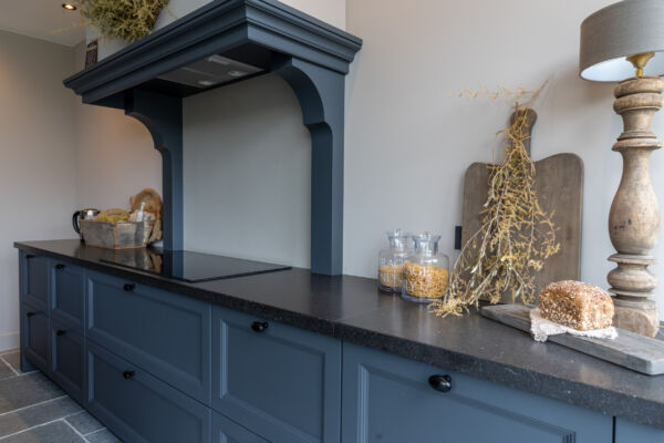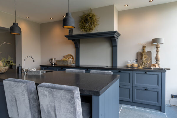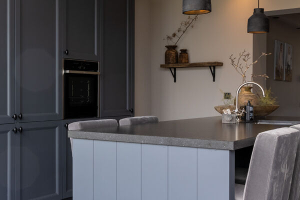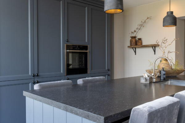 Het centrale middelpunt van deze keuken is het spoel- / bareiland, waar men op de hoge barkrukken heerlijk kan zitten. Het composiet blad in Belgisch hardsteen look geeft het geheel een rijke uitstraling. Dit geeft een mooi contrast bij de ingetoge kleur ‘Black Smoke’ van Pure and Original.