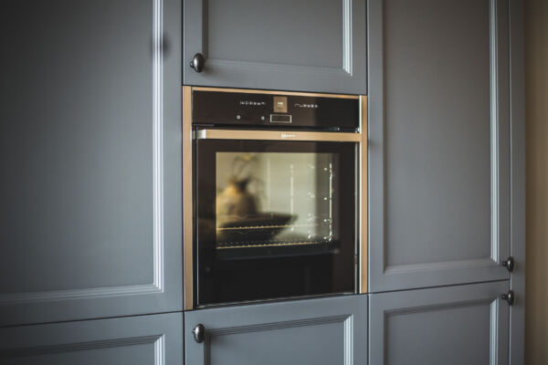 Koken doet men aan de langszijde van de keuken, waar men veel werkruimte heeft rondom de Neff inductieplaat. De schouw met geïntegreerde afzuiging maakt het plaatje compleet. Aan de andere zijde is een kastenwand geplaatst, voorzien van de nodige inbouwapparatuur en veel bergruimte.