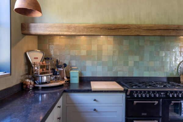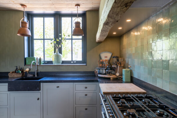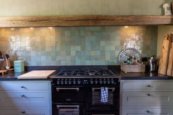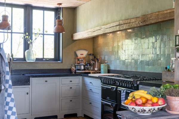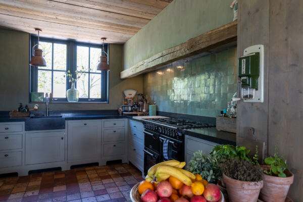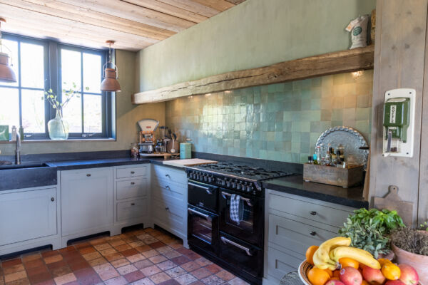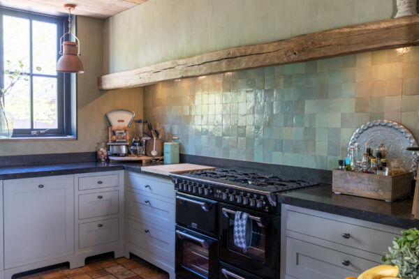 Het Stoves Richmond fornuis is met maar liefst 4 ovens, 7 kookzones – waaronder een wokbrander – een echte blikvanger. De oude eikenbalk en de achterwand van zelliges completeren de landelijke stijl.