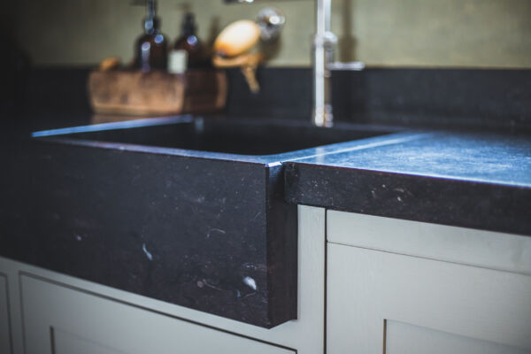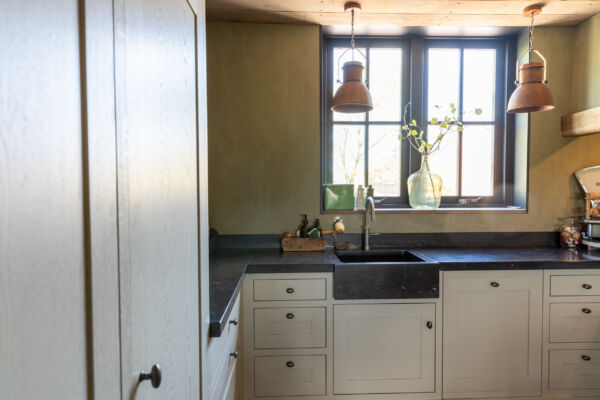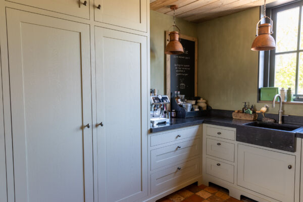 De keuken in u-vorm heeft maar liefst drie werkruimtes op het keukenblad dat is vervaardigd uit massief Belgisch hardsteen van 40mm dik. De keuken is uitgevoerd in massief geborsteld eiken dat is gespoten in een mooie grijstint, ook wel kiezelgrijs genoemd. Samen met de strakke fronten vormt dit een sfeervol geheel.