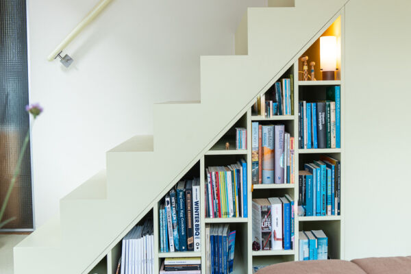 De trap kreeg nieuwe tredes en stootplanken, de balustrade werd uitgevoerd in dezelfde stijl. De ruimte onder de trap is optimaal benut met een open boekenkast en een kast voor de koelkast. Alles is uitgevoerd in gespoten lakwerk: fronten, trap, trapkast en balustrade in zachtgroen, met een iets donkerder tint aan de binnenzijde van de kasten.