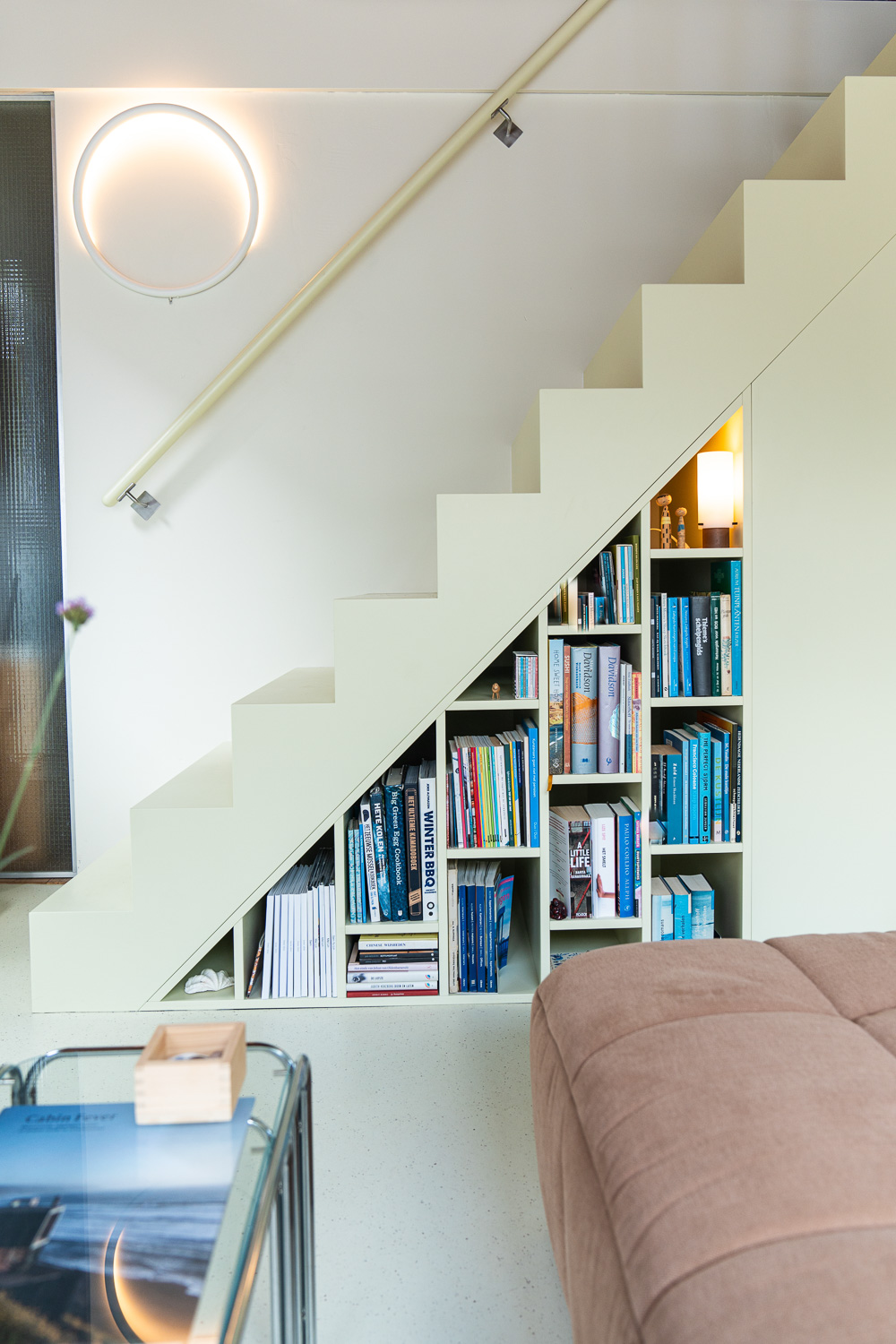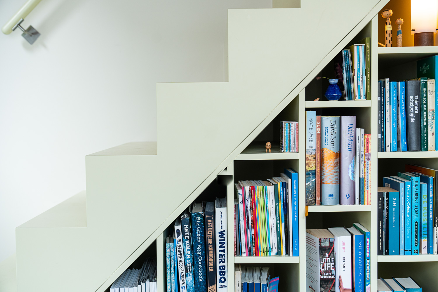 De trap kreeg nieuwe tredes en stootplanken, de balustrade werd uitgevoerd in dezelfde stijl. De ruimte onder de trap is optimaal benut met een open boekenkast en een kast voor de koelkast. Alles is uitgevoerd in gespoten lakwerk: fronten, trap, trapkast en balustrade in zachtgroen, met een iets donkerder tint aan de binnenzijde van de kasten.