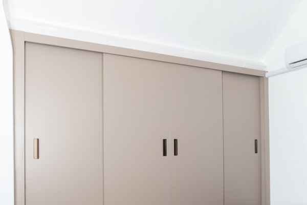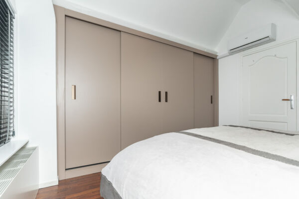 Voor deze woning realiseerden we wandkasten op zowel de slaapkamer als de overloop, volledig afgestemd op de schuine daklijn. In de slaapkamer is de ruimte langs de schuine wand optimaal benut met een doordachte indeling van legplanken, binnenlades en een hanggedeelte. De kasten zijn uitgevoerd in een warme amandelbeige tint, met schuifdeuren voorzien van een schuifsysteem en ingefreesde grepen in metallic bruin wat een subtiele bronslook heeft. De binnenzijde in diamantgrijs vormt een warme, rustige combinatie met de buitenzijde, terwijl zwart hang- en sluitwerk zorgt voor een krachtig en verfijnd contrast.