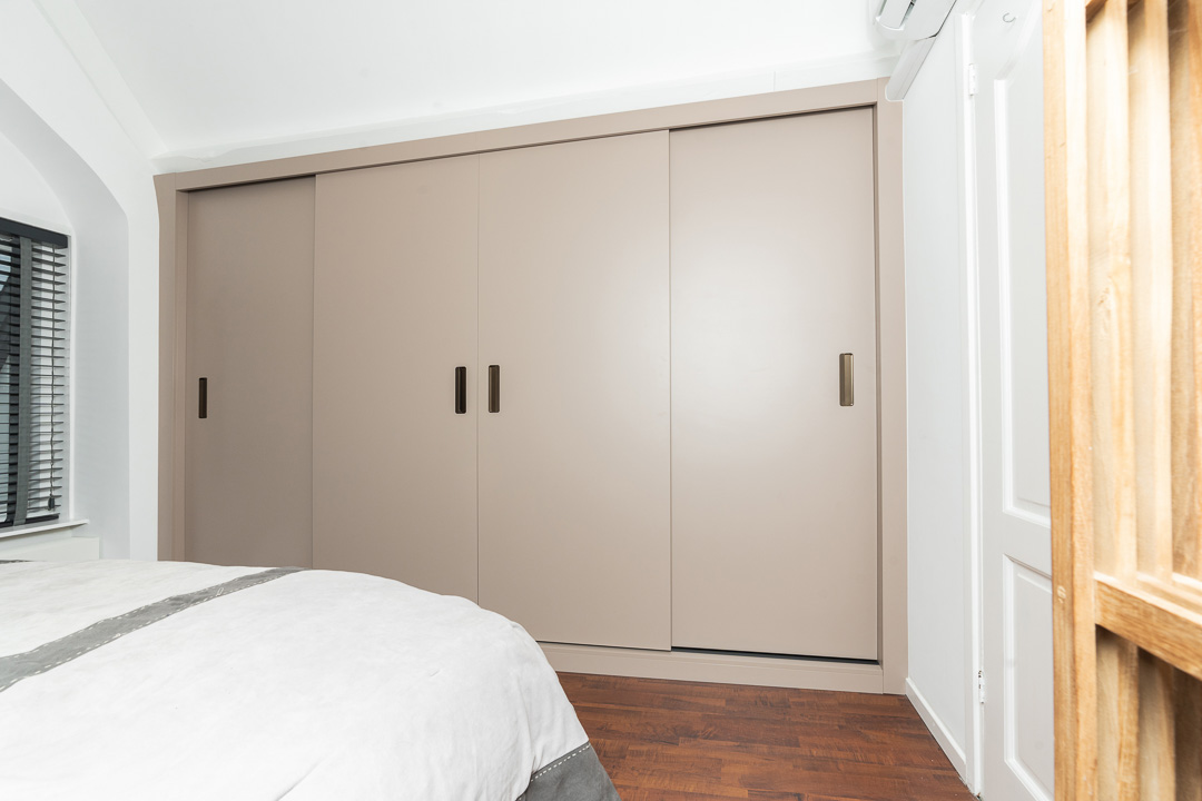 Voor deze woning realiseerden we wandkasten op zowel de slaapkamer als de overloop, volledig afgestemd op de schuine daklijn. In de slaapkamer is de ruimte langs de schuine wand optimaal benut met een doordachte indeling van legplanken, binnenlades en een hanggedeelte. De kasten zijn uitgevoerd in een warme amandelbeige tint, met schuifdeuren voorzien van een schuifsysteem en ingefreesde grepen in metallic bruin wat een subtiele bronslook heeft. De binnenzijde in diamantgrijs vormt een warme, rustige combinatie met de buitenzijde, terwijl zwart hang- en sluitwerk zorgt voor een krachtig en verfijnd contrast.