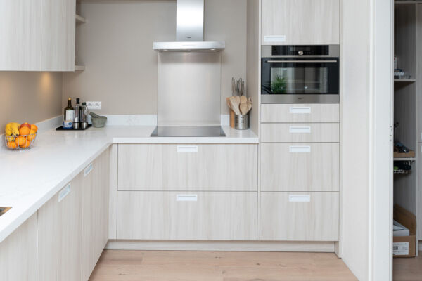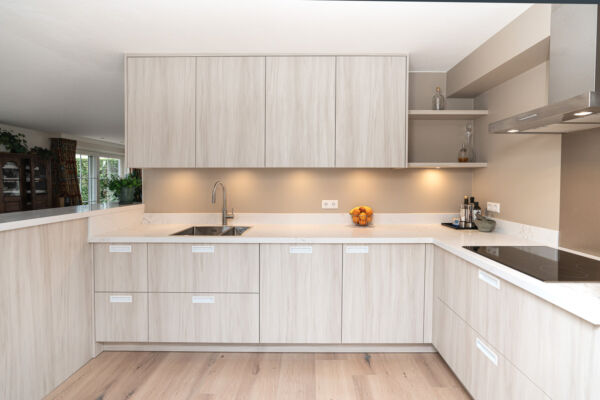 Voor het werkblad is gekozen voor een licht, wit stenen blad met een verfijnde marmering. Langs de muur is een smetplint aangebracht, waardoor de keuken praktisch en onderhoudsvriendelijk blijft. Bij het kookgedeelte is een Alusplash geplaatst, dat niet alleen eenvoudig schoon te maken is, maar ook prachtig matcht met de roestvrijstalen afzuiging. De keuken combineert een moderne uitstraling met praktische details. Zo zijn de grepen in de fronten subtiel ingefreesd: dit geeft de strakke look van een greeploze keuken, maar met het gebruiksgemak van een greep. Onder de wandkasten is verlichting verwerkt die het werkblad mooi uitlicht. In de hoek zorgen open wandplanken voor een speels accent en ruimte om persoonlijke items of sfeervolle accessoires neer te zetten.
