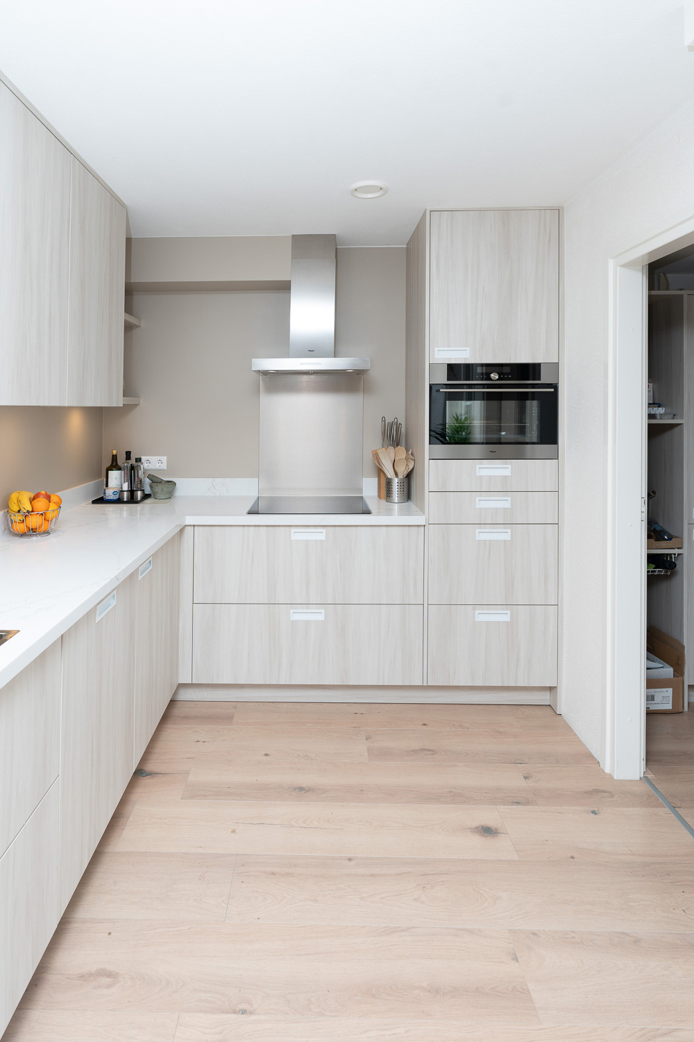 Een lichte, rustige keuken die perfect aansluit bij de woning en waarin maatwerk zorgt voor rust, eenheid en praktisch gemak.
